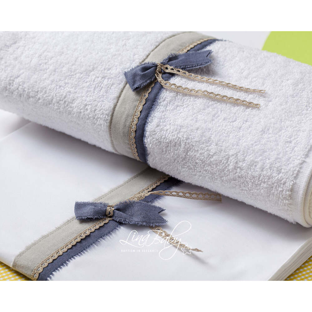 Υπέροχο βαμβακερό σετ λαδόπανων σε δύο αποχρώσεις. Το λευκό λαδόπανο συνδυάζεται με διακοσμητική τρέσα με ξέφτι γκρί-μπλε και όμορφο φιογκάκι γραβατούλα σε μπλε στην μέση. Ενώ το εκρού λαδόπανο συνδυάζεται με διακοσμητική τρέσα με ξέφτι μέντα-γκρι, και όμορφο φιογκάκι γραβατούλα σε γκρί απόχρωση στην μέση.