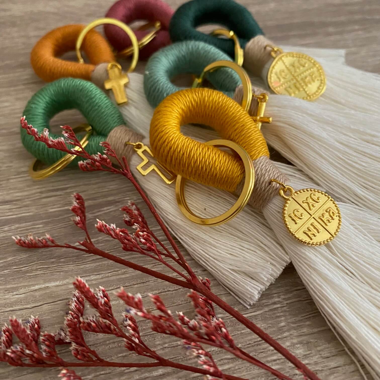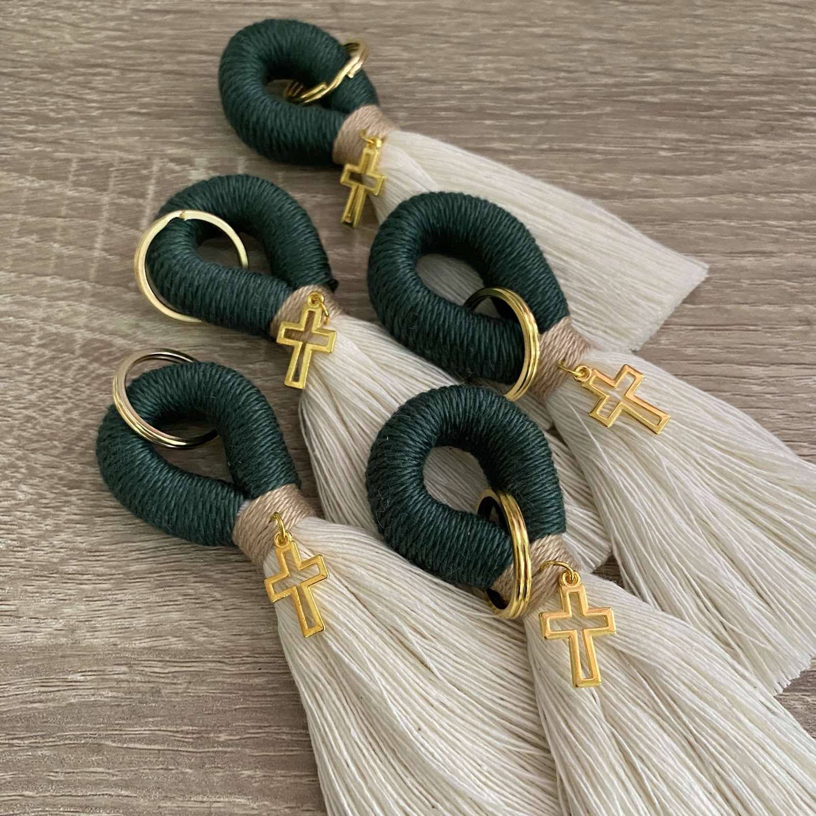 Μαρτυρικά βάπτισης για αγόρι μακραμέ μπρελόκ σε αποχρώσεις του πράσινου με μεταλλικό χρυσό αγιοκωνσταντινάτο ή σταυρουδάκι της επιλογής σας. Υπάρχει η δυνατότητα κατασκευής και σε άλλους χρωματικούς συνδυασμούς.