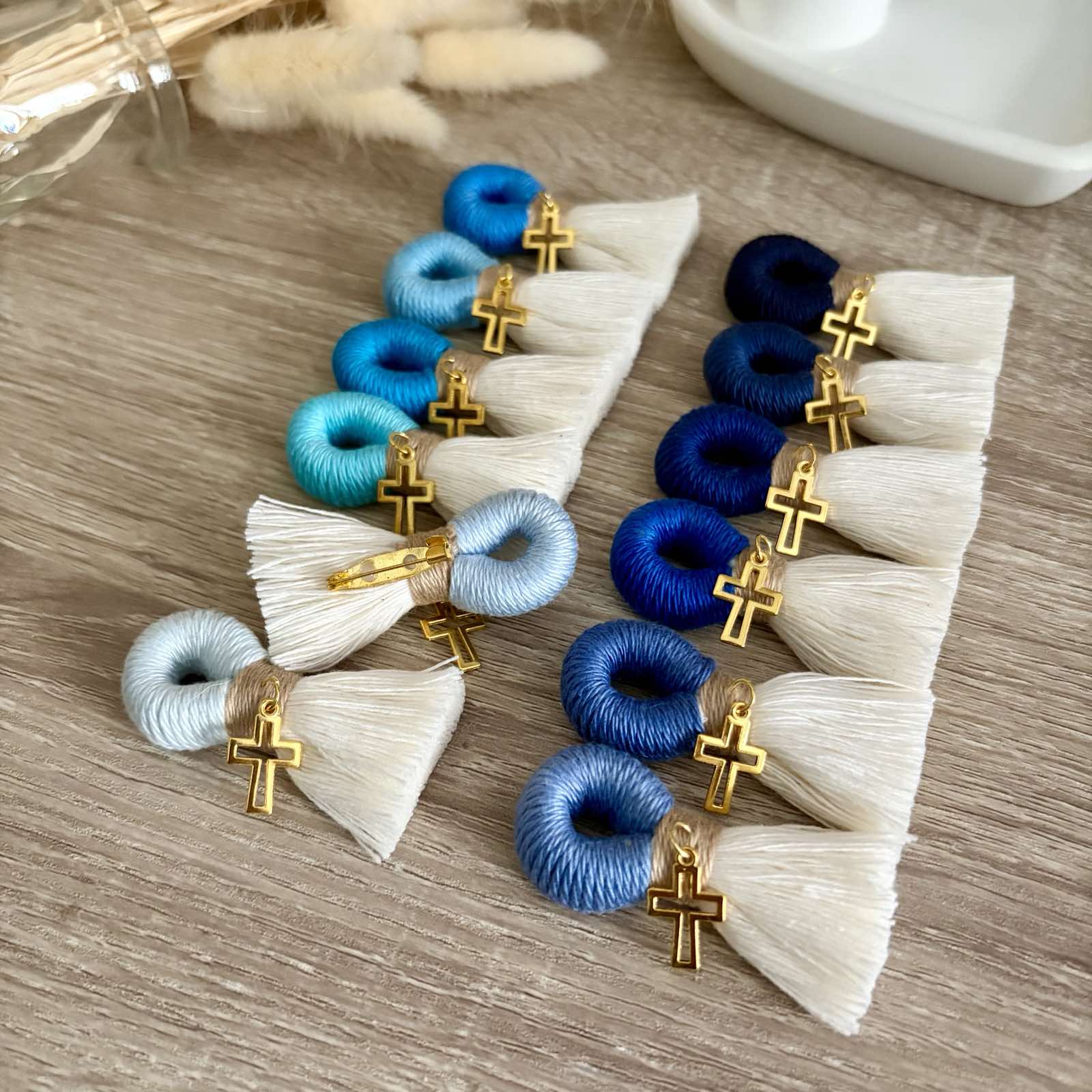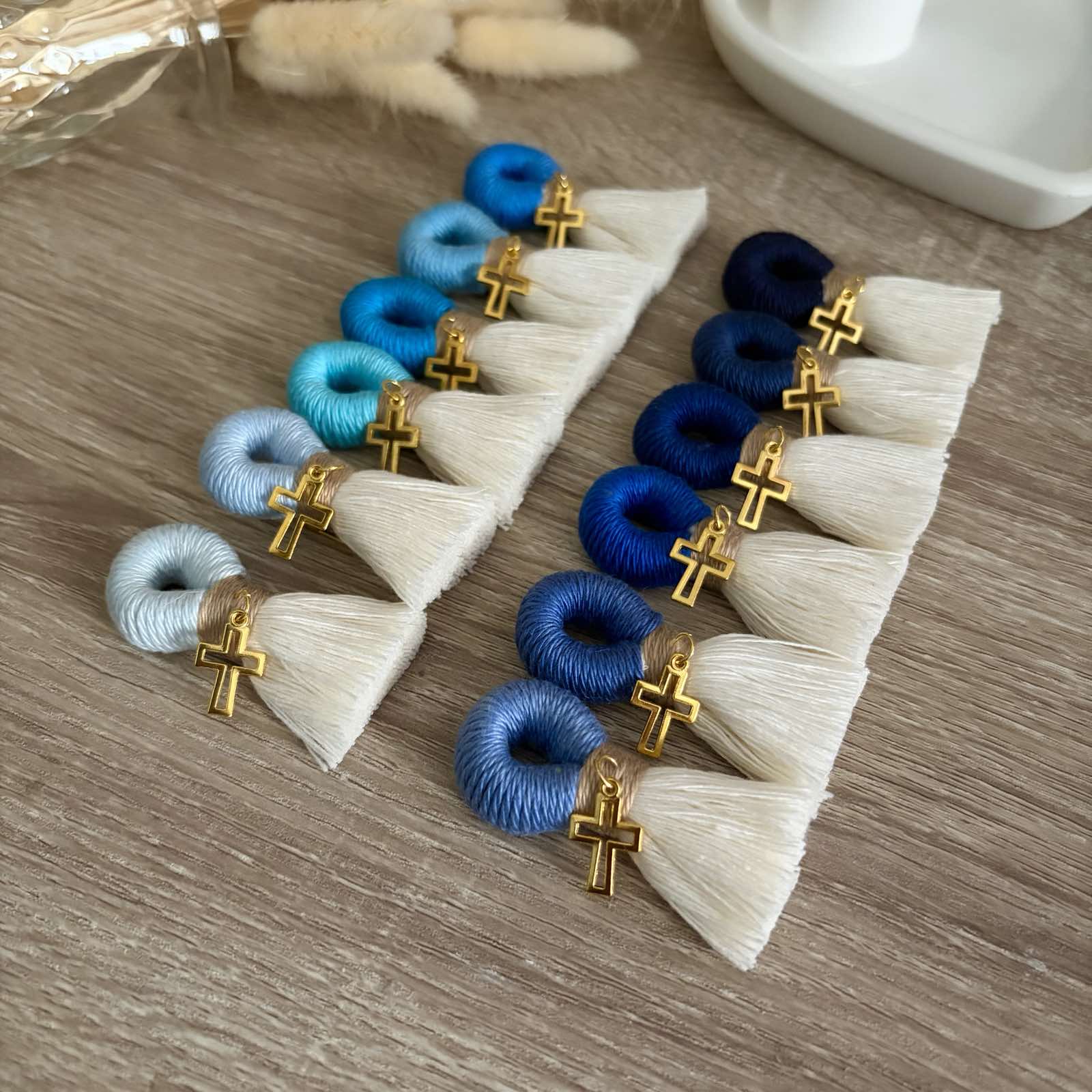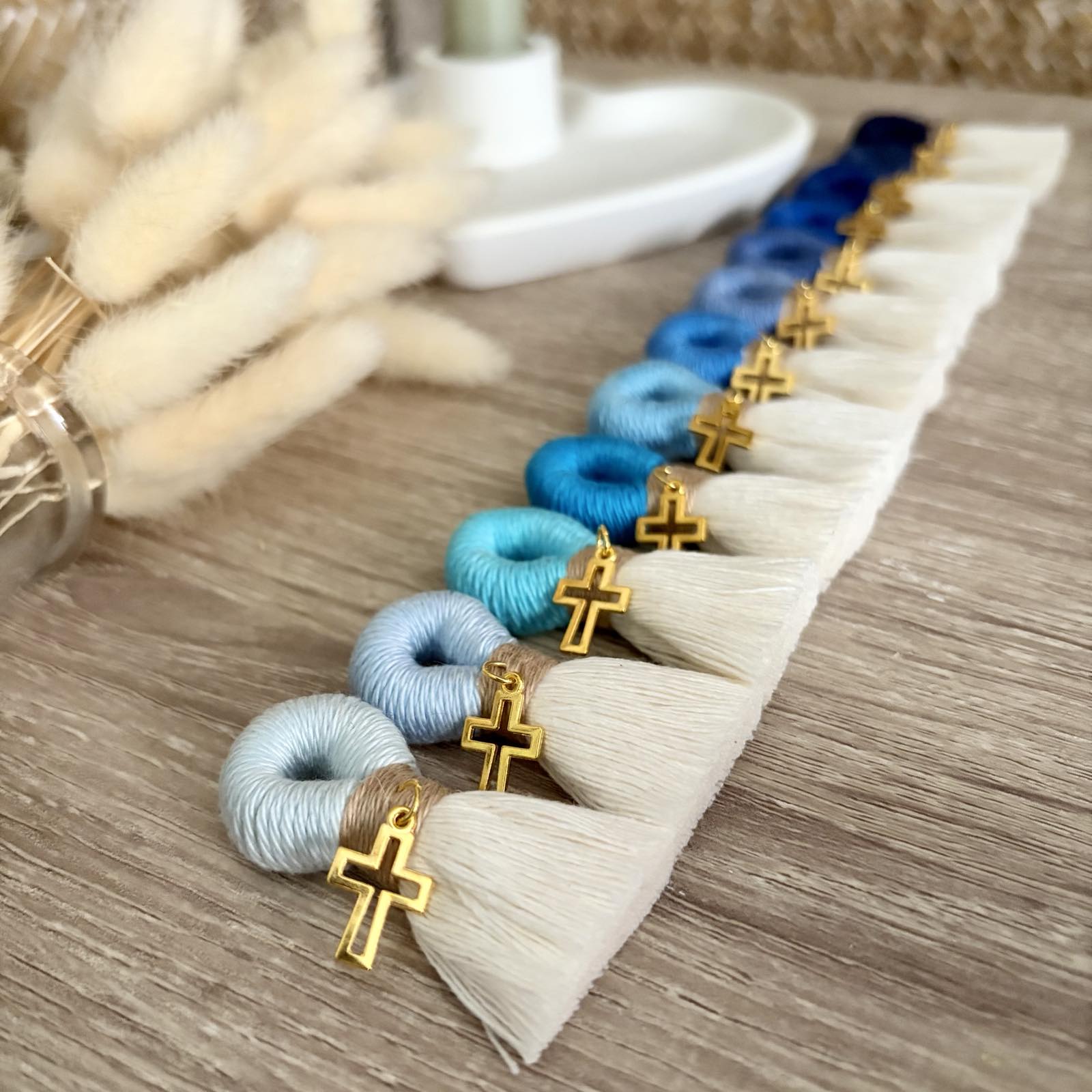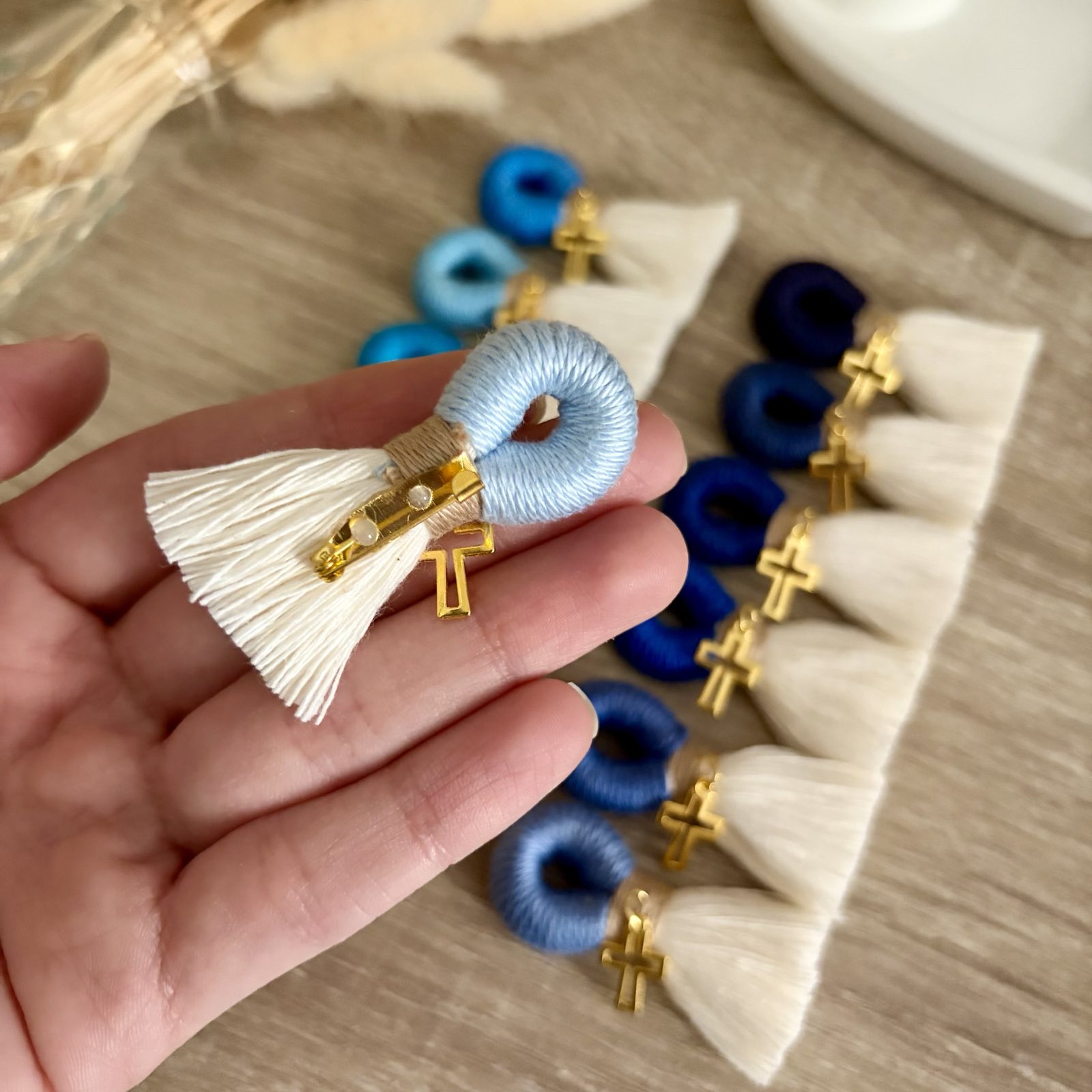Μαρτυρικά βάπτισης μακραμέ σε μορφή πέτου, σε μπλε αποχρώσεις, διακοσμημένα με μεταλλικό χρυσό σταυρουδάκι. Διαθέτουν παραμάνα στο πίσω μέρος. Υπάρχει η δυνατότητα κατασκευής και σε άλλους χρωματικούς συνδυασμούς.
