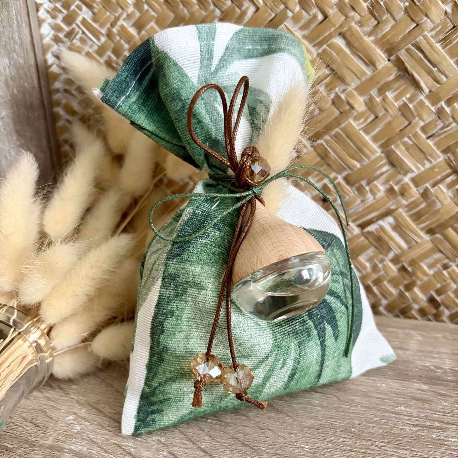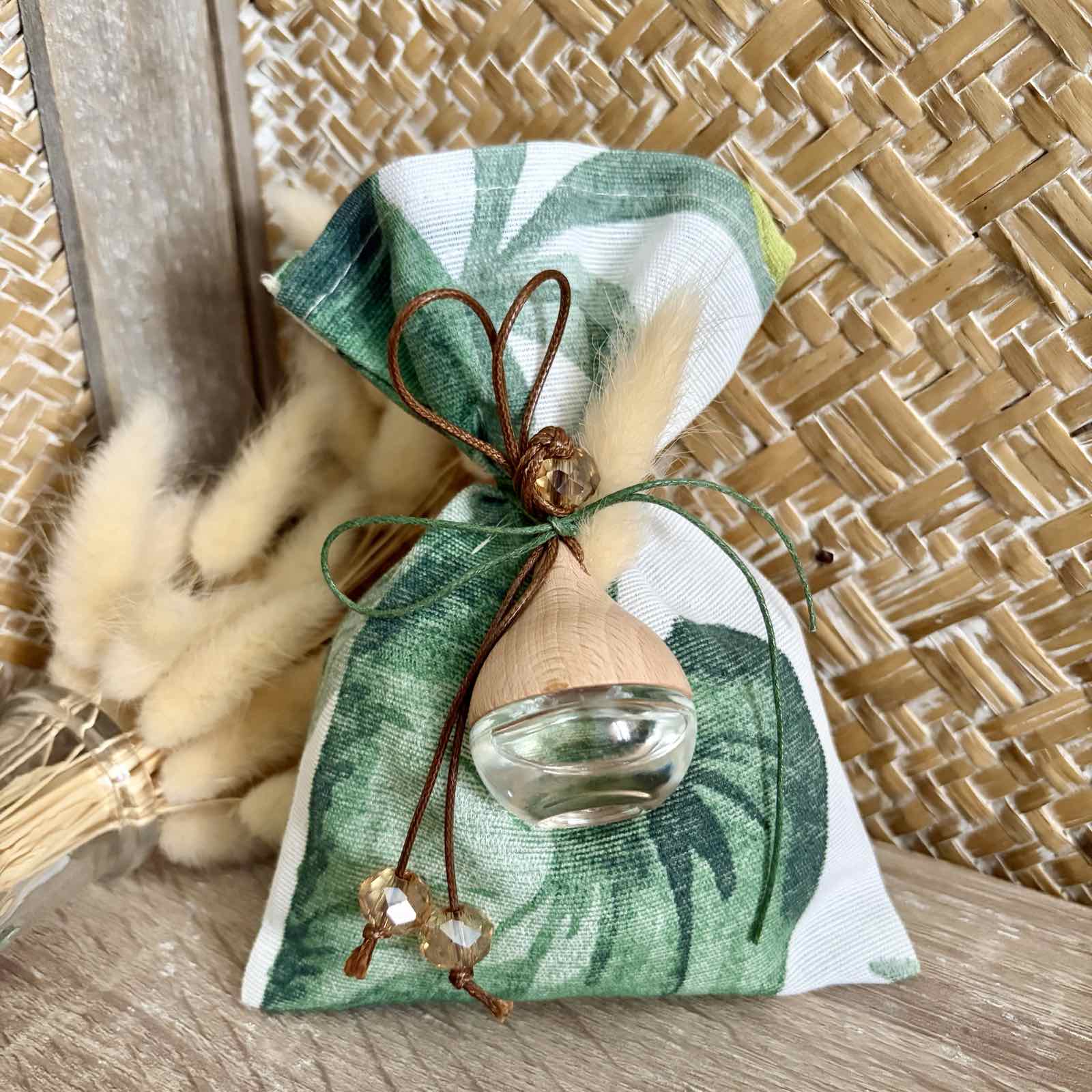 Μπομπονιέρα βάπτισης αρωματικό αυτοκινήτου 6ml σε μπουκαλάκι με χάντρες, δεμένο σε πουγκί με τυπωμένα τροπικά φύλλα και αποξηραμένο λευκό lagurus.