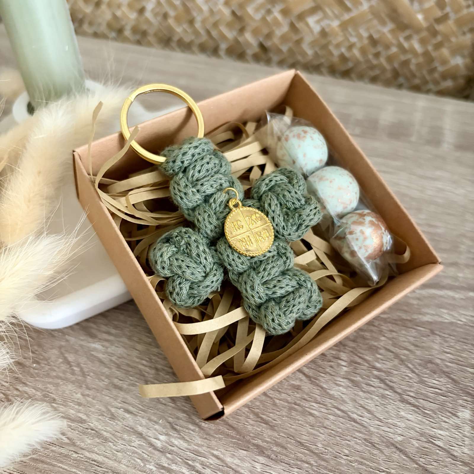 Μπομπονιέρα Βάπτισης Μακραμέ Σταυρός Μπρελόκ Σε Κουτάκι