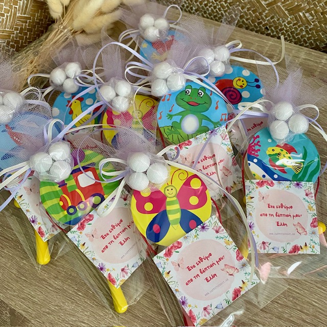Παιδική μπομπονιέρα βάπτισης ξύλινο τυμπανάκι στρογγυλό σε 9 σχέδια. Διατίθεται σε σετ των 9 τεμαχίων (1 τεμάχιο απο κάθε σχέδιο). Το τούλι, οι κορδέλες και το αυτοκόλλητο μπορούν να αλλάξουν, ώστε να ταιριάζουν στα χρώματα και το θέμα της δικής σας βάπτισης.