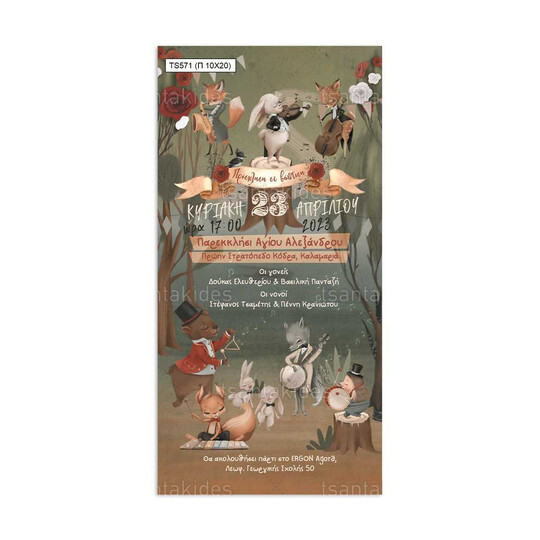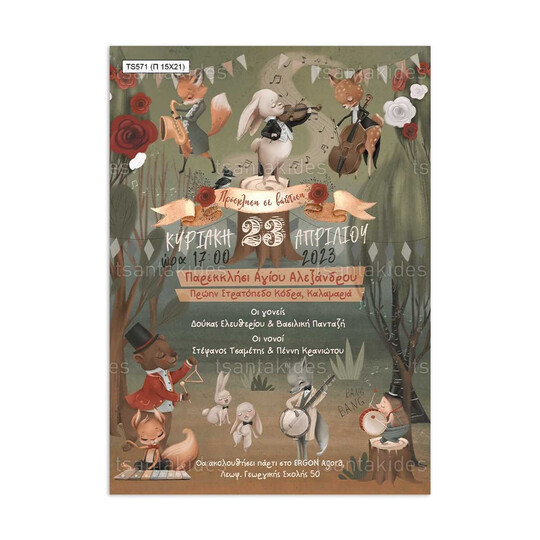 Προσκλητήριο βάπτισης παπυράκι εκτυπωμένο με θέμα Woodland Musicians