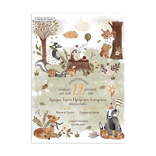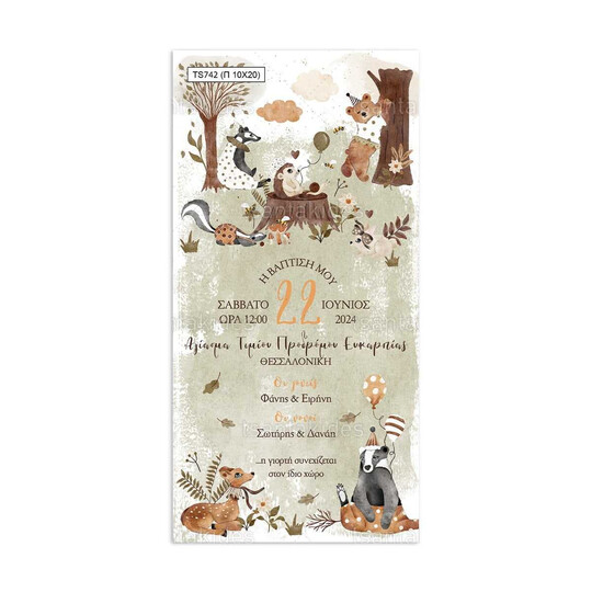 Προσκλητήριο βάπτισης παπυράκι εκτυπωμένο με θέμα Ζωάκια του δάσους