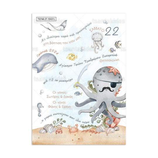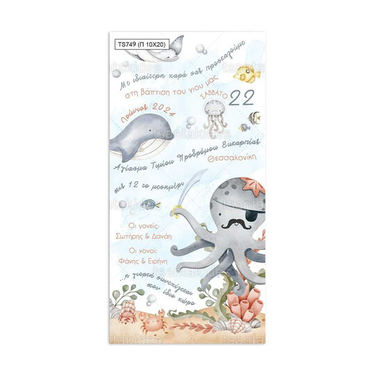 Προσκλητήριο βάπτισης παπυράκι εκτυπωμένο με θέμα Under the sea pirate