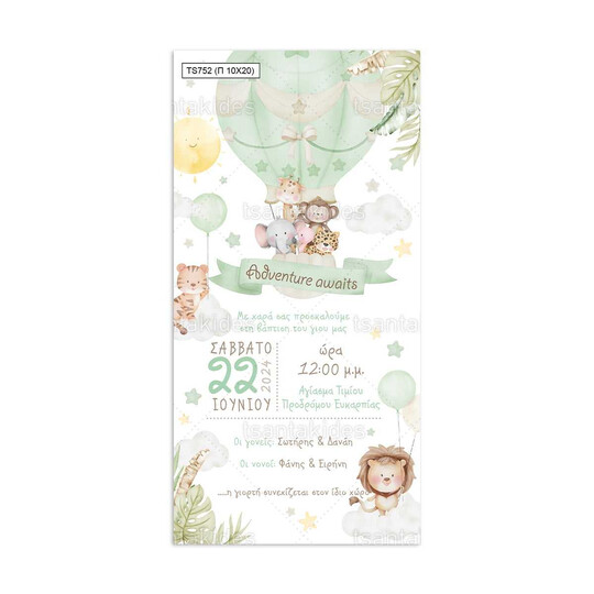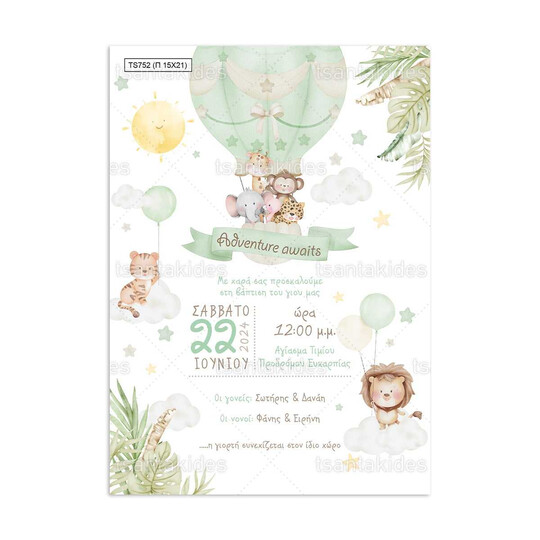 Προσκλητήριο βάπτισης παπυράκι εκτυπωμένο με θέμα Jungle animals on a hot air balloon
