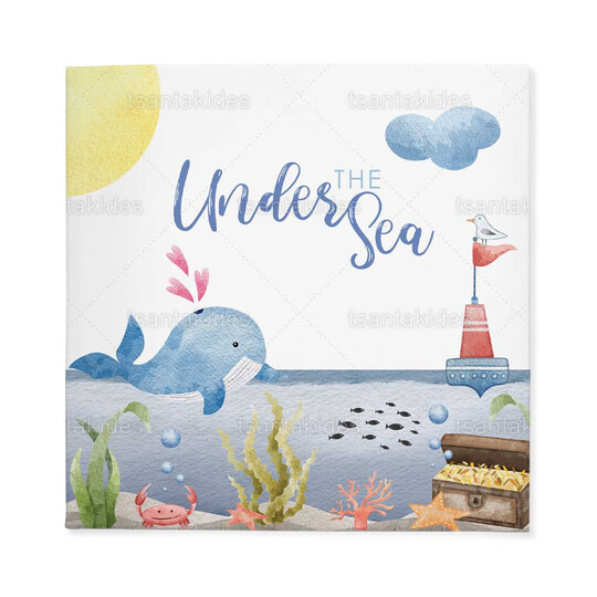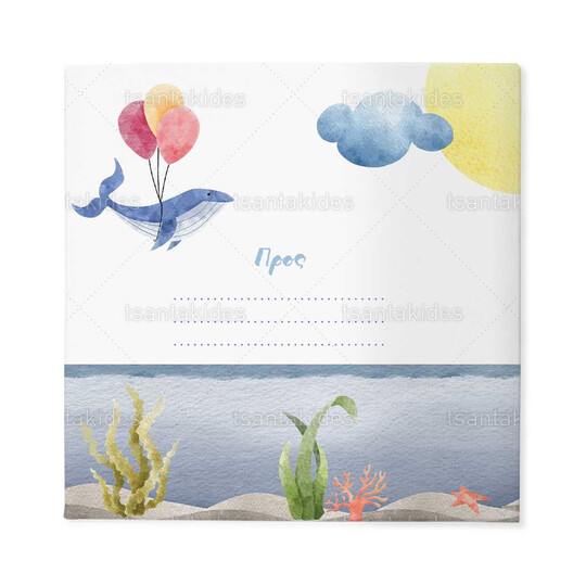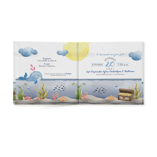 Προσκλητήριο σκληρό καπάκι,  παραμυθάκι μικρό, εκτυπωμένο με θέμα  τη θάλασσα και το μικρό φαλαινάκι