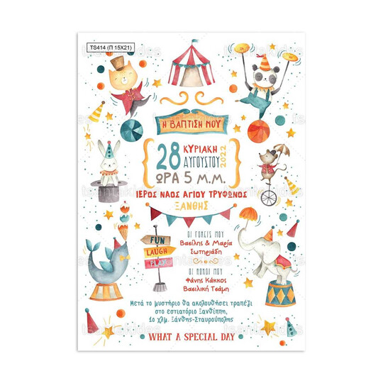 Προσκλητήριο βάπτισης παπυράκι εκτυπωμένο με θέμα Circus
