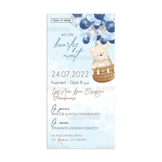 Προσκλητήριο βάπτισης παπυράκι εκτυπωμένο με θέμα Bear Balloons