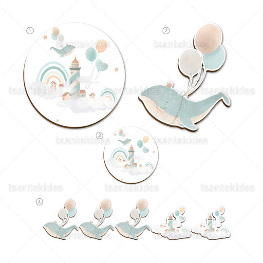 Ξύλινο σετ διακόσμησης εκτυπωμένο με θέμα Flying Whale with Balloons