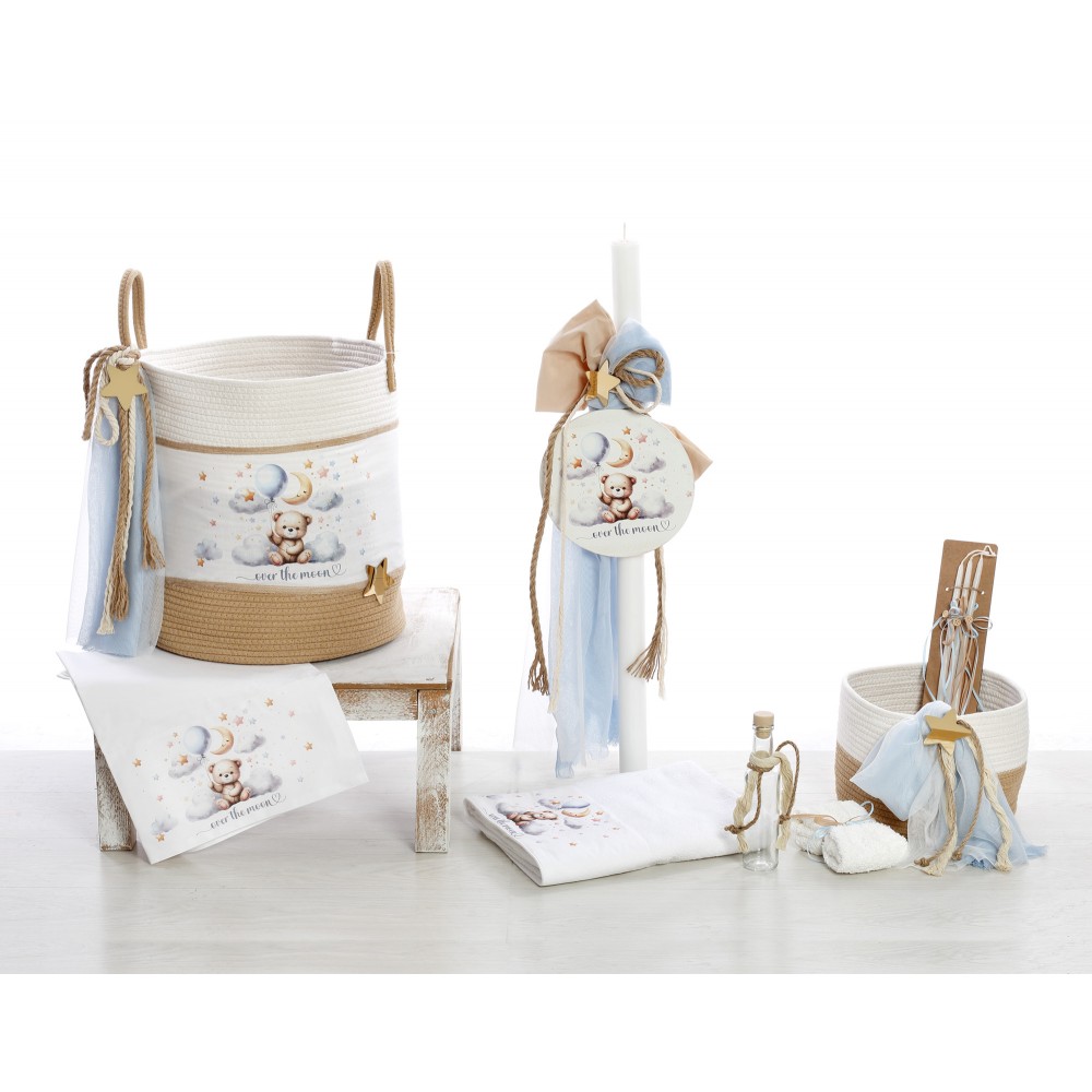 Ολοκληρωμένο βαπτιστικό σετ της εταιρίας Bellissimo με θέμα το Αρκουδάκι και το Φεγγάρι, διακοσμημένο με υψηλής ποιότητας UV εκτύπωση σε dreamy παστέλ αποχρώσεις του γαλάζιου, μπεζ και χρυσού. Ένα μαγευτικό σετ, ιδανικό για μια παραμυθένια και κομψή βάπτιση. Το σετ περιλαμβάνει: