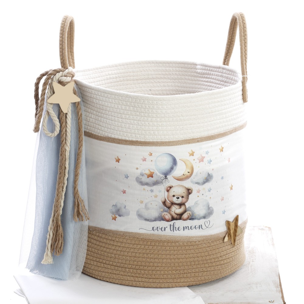 ✔ Πλεκτό καλάθι βάπτισης, διακοσμημένο με UV εκτύπωση αρκουδάκι στα σύννεφα, φεγγάρι και αστέρια, κορδόνια και διακοσμητικά στοιχεία. (Διαστάσεις: 50cm x 40cm x 40cm)
