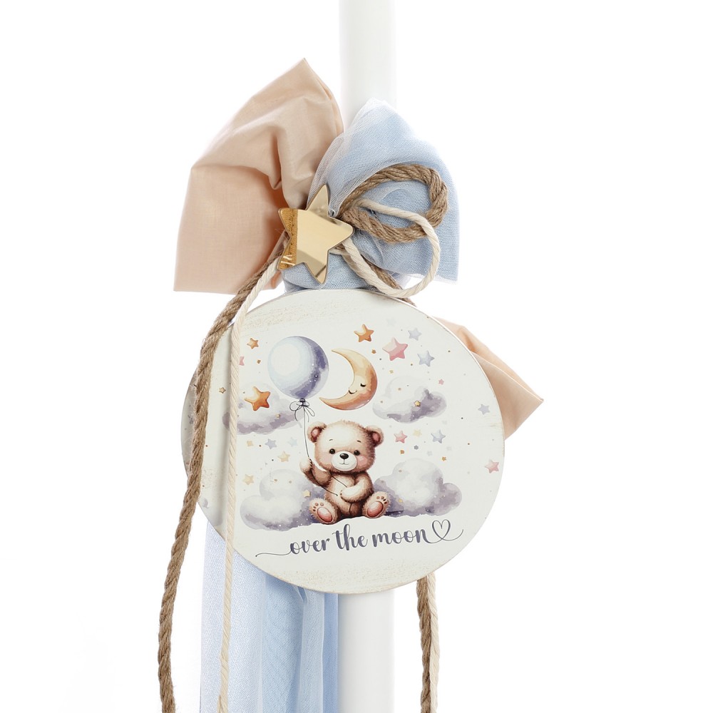 ✔ Λαμπάδα βάπτισης, διακοσμημένη με ξύλινο διακοσμητικό στοιχείο UV εκτύπωσης αρκουδάκι και φεγγάρι, κορδέλες, αστέρια και αέρινα υφάσματα.