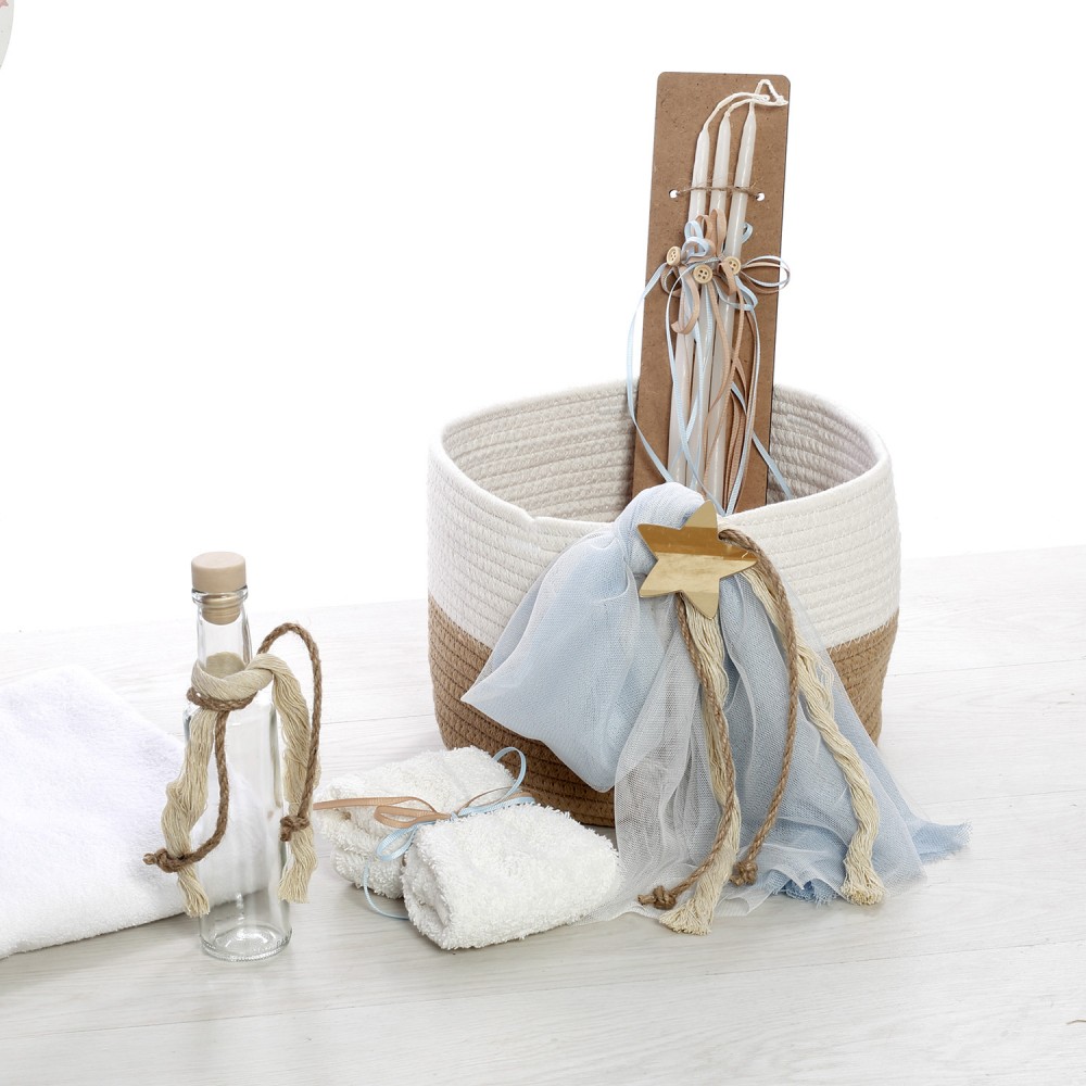 Προαιρετικά, μπορείτε να προσθέσετε στο ίδιο θέμα ποδιά νονού, βιβλίο ευχών, κορνίζα ευχών, στολισμό κολυμπήθρας και κουτί μαρτυρικών.