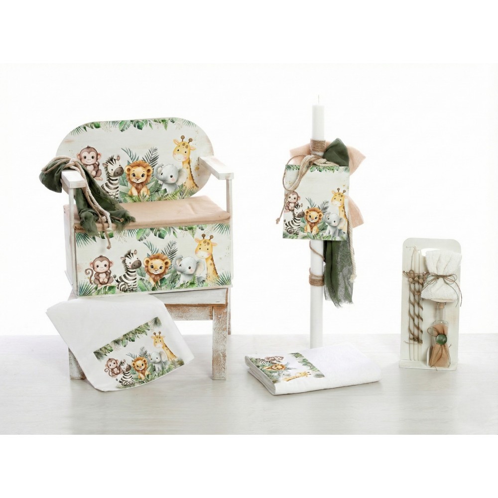 Ολοκληρωμένο πακέτο βάπτισης για αγόρι με θέμα "Jungle Animals" (Ζώα της Ζούγκλας) που περιλαμβάνει ξύλινο παγκάκι-μπαούλο. Μια πρακτική και διακοσμητική πρόταση σε γήινες αποχρώσεις.