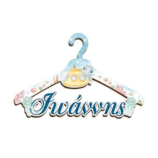 Ξύλινη παιδική κρεμάστρα εκτυπωμένη με θέμα το υποβρύχιο και το μικρό χταπόδι