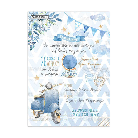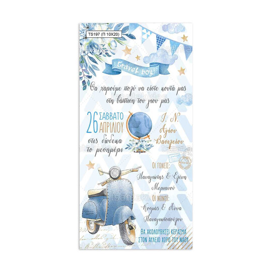 Προσκλητήριο βάπτισης παπυράκι εκτυπωμένο με θέμα vespa