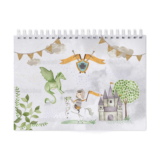 Παιδική μπομπονιέρα βάπτισης μπλοκ ζωγραφικής με διάσταση 21x29cm, εκτυπωμένο με θέμα Ιππότης Και Δράκος.