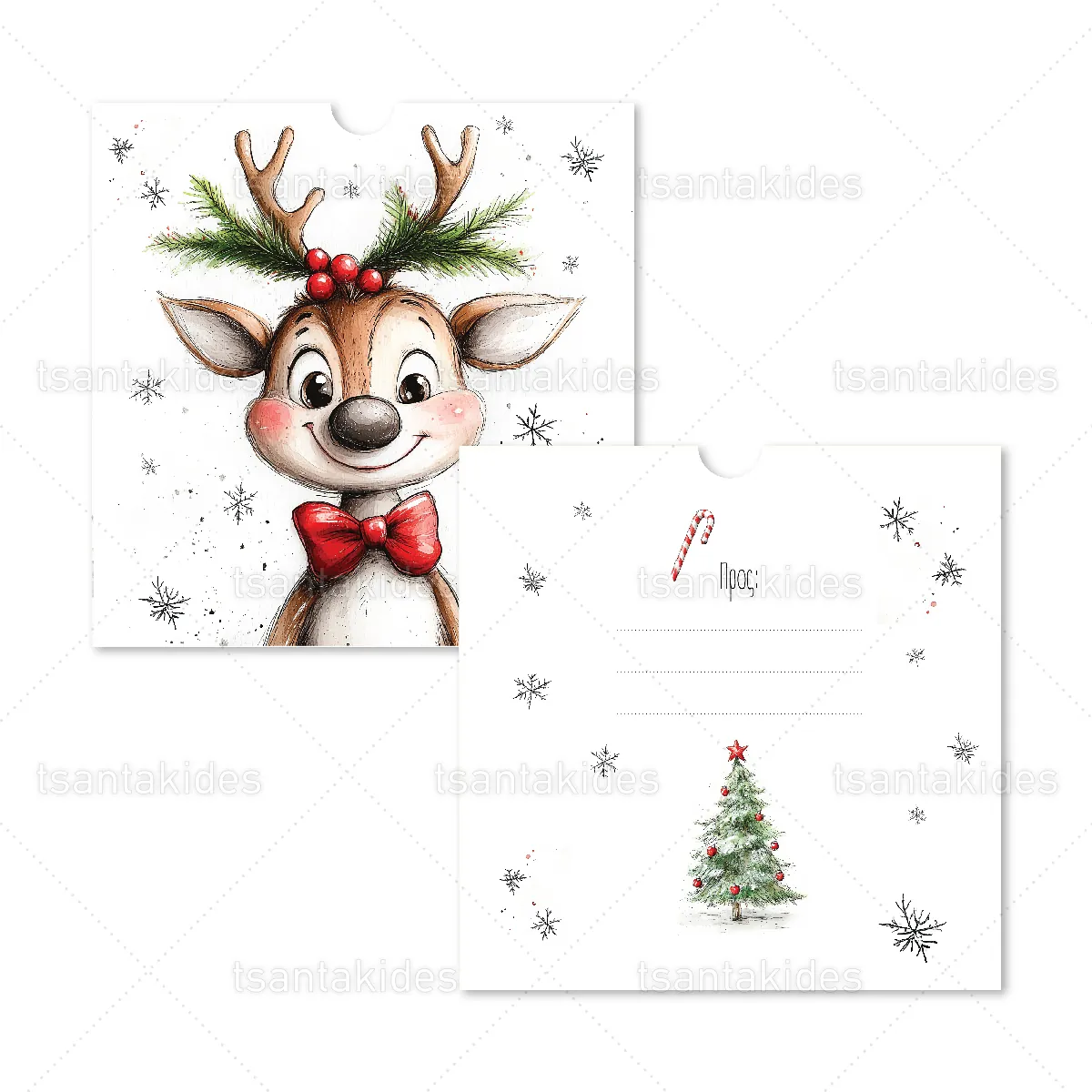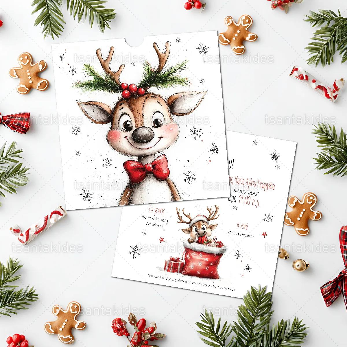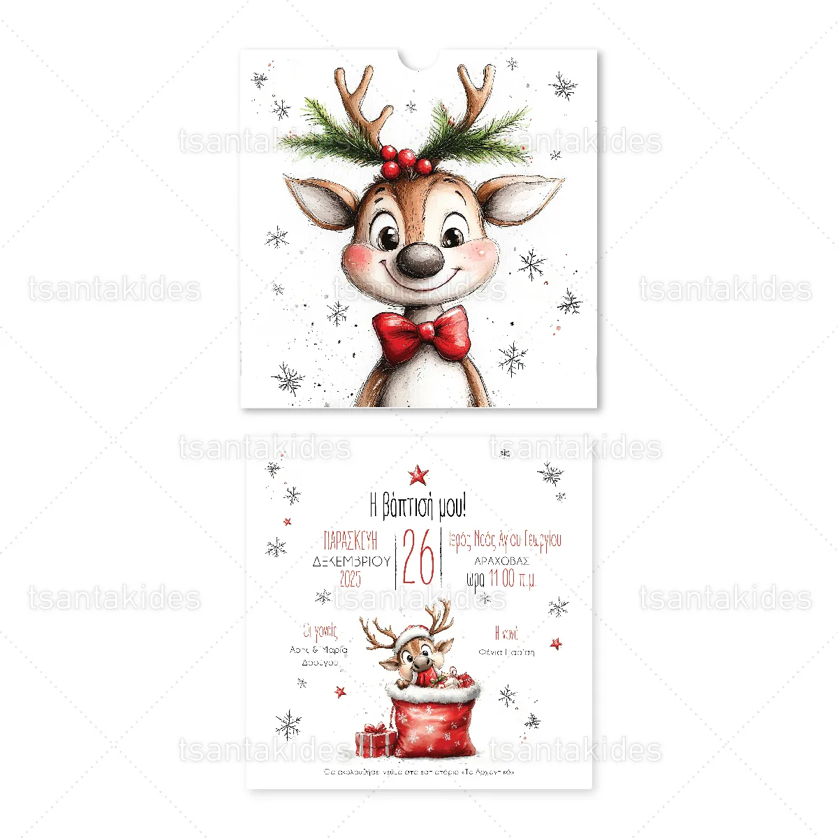Προσκλητήριο βάπτισης εκτυπωμένο με θέμα Funny Xmas Reindeer.