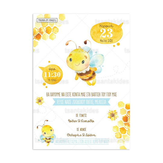 Προσκλητήριο βάπτισης παπυράκι εκτυπωμένο με θέμα τη μέλισσα