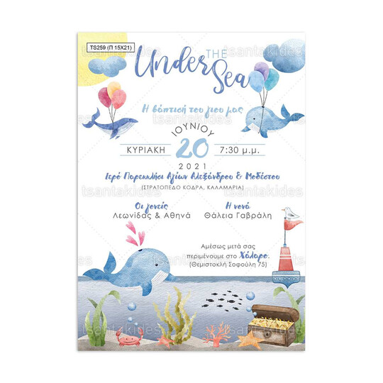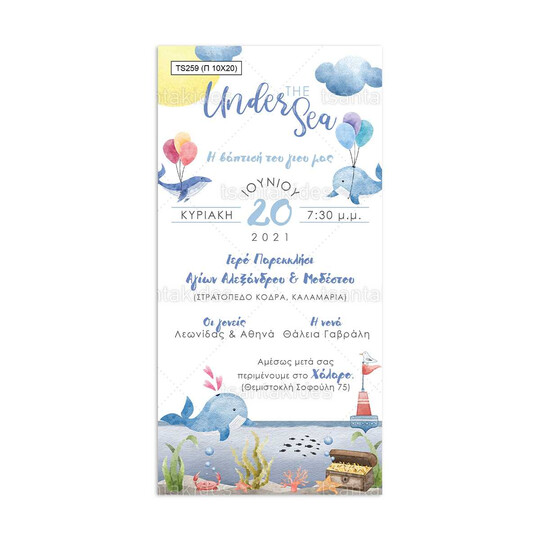 Προσκλητήριο βάπτισης παπυράκι εκτυπωμένο με θέμα τη θάλασσα και το μικρό φαλαινάκι