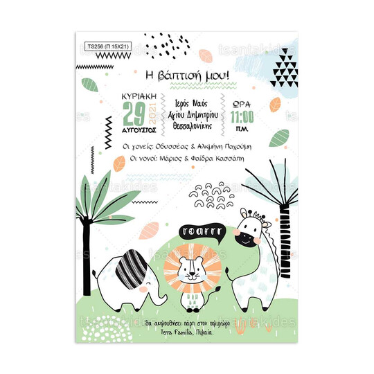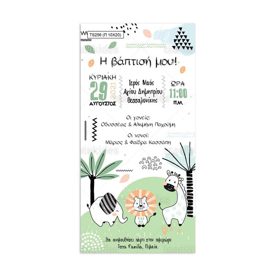 Προσκλητήριο βάπτισης παπυράκι εκτυπωμένο με θέμα τα ζώα της ζούγκλας