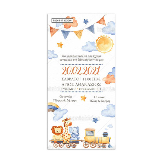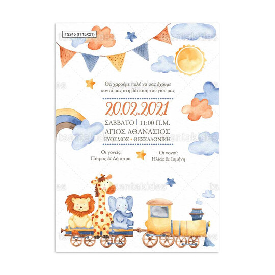 Προσκλητήριο βάπτισης παπυράκι εκτυπωμένο με θέμα το τρενάκι και τα ζώα της ζούγκλας