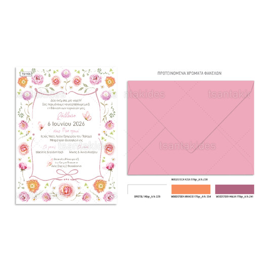 Η κάρτα του προσκλητηρίου είναι τυπωμένη σε λευκό ματ χαρτί 250 γρ. Το προσκλητήριο διαθέτει φάκελο διάστασης 19,5 x 14,5 εκ. σε χαρτί της επιλογής σας από τους αναγραφόμενους κωδικούς.