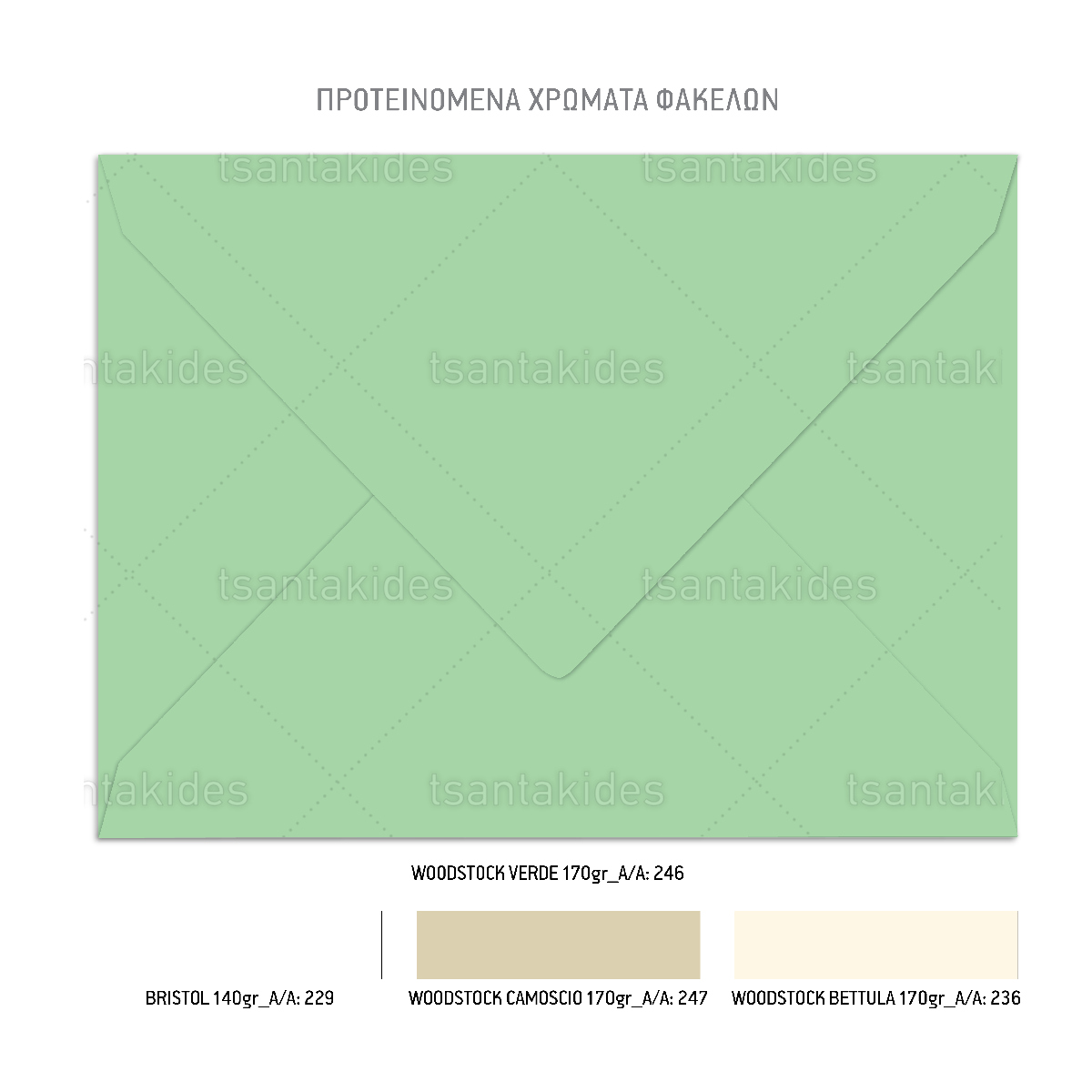 Η κάρτα του προσκλητηρίου είναι τυπωμένη σε λευκό ματ χαρτί 250 γρ. Το προσκλητήριο διαθέτει φάκελο διάστασης 19,5 x 14,5 εκ. σε χαρτί της επιλογής σας από τους αναγραφόμενους κωδικούς.