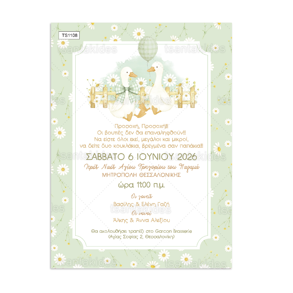 Προσκλητήριο βάπτισης για δίδυμα με θέμα Silly Geese.