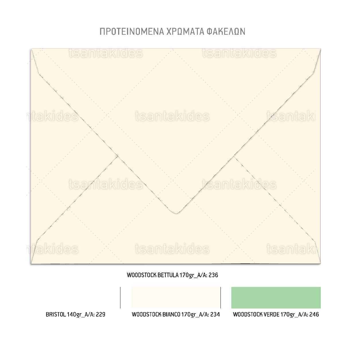 Η κάρτα του προσκλητηρίου είναι τυπωμένη σε λευκό ματ χαρτί 250 γρ. Το προσκλητήριο διαθέτει φάκελο διάστασης 19,5 x 14,5 εκ. σε χαρτί της επιλογής σας από τους αναγραφόμενους κωδικούς.