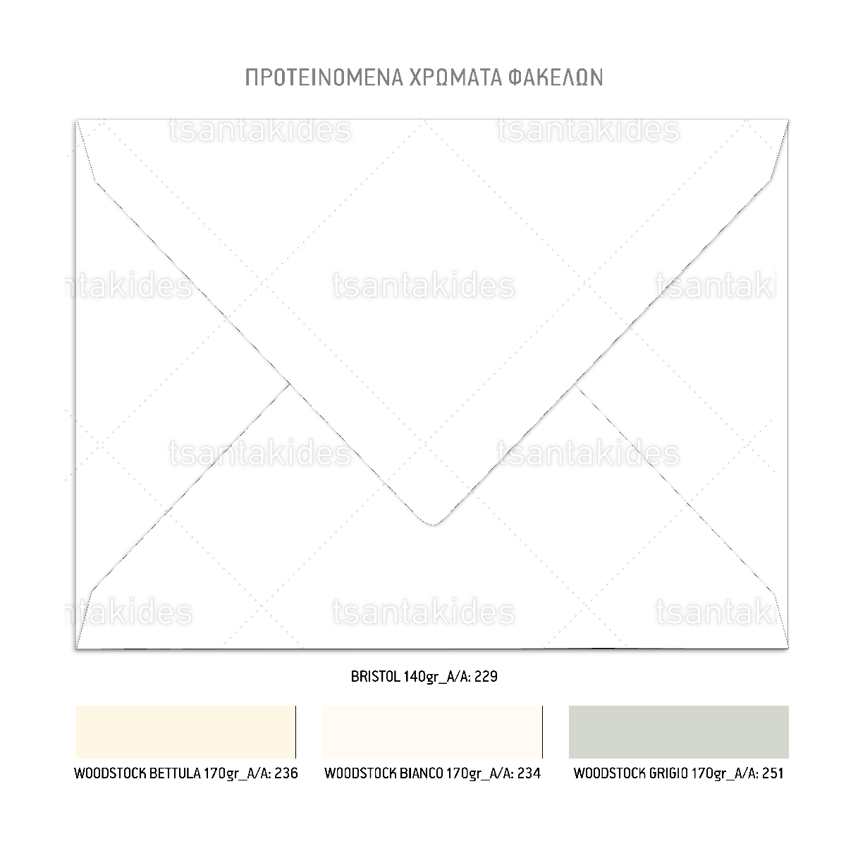 Η κάρτα του προσκλητηρίου είναι τυπωμένη σε λευκό ματ χαρτί 250 γρ. Το προσκλητήριο διαθέτει φάκελο διάστασης 19,5 x 14,5 εκ. σε χαρτί της επιλογής σας από τους αναγραφόμενους κωδικούς.