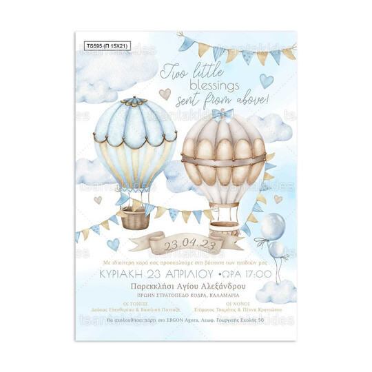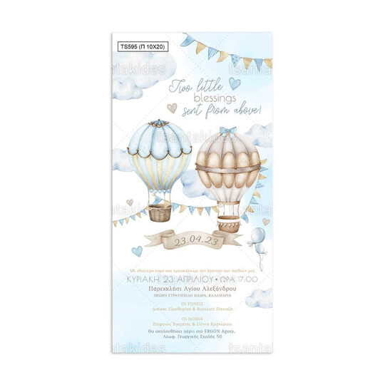 Προσκλητήριο βάπτισης παπυράκι εκτυπωμένο με θέμα Baby Boys Hot Air Balloon