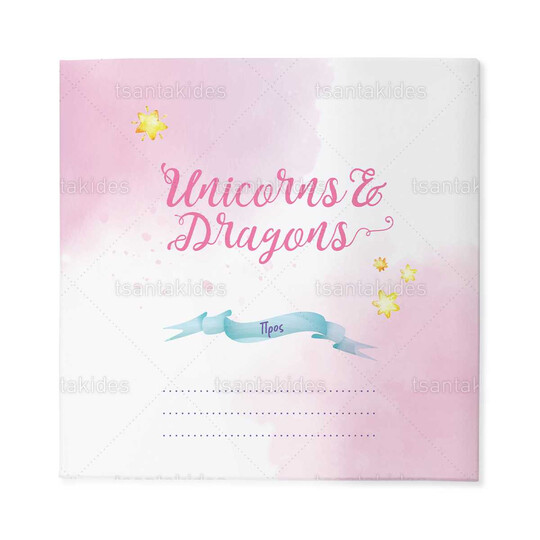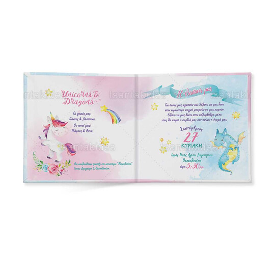 Προσκλητήριο σκληρό καπάκι, παραμυθάκι μικρό, εκτυπωμένο με θέμα το μονόκερο και το δράκο