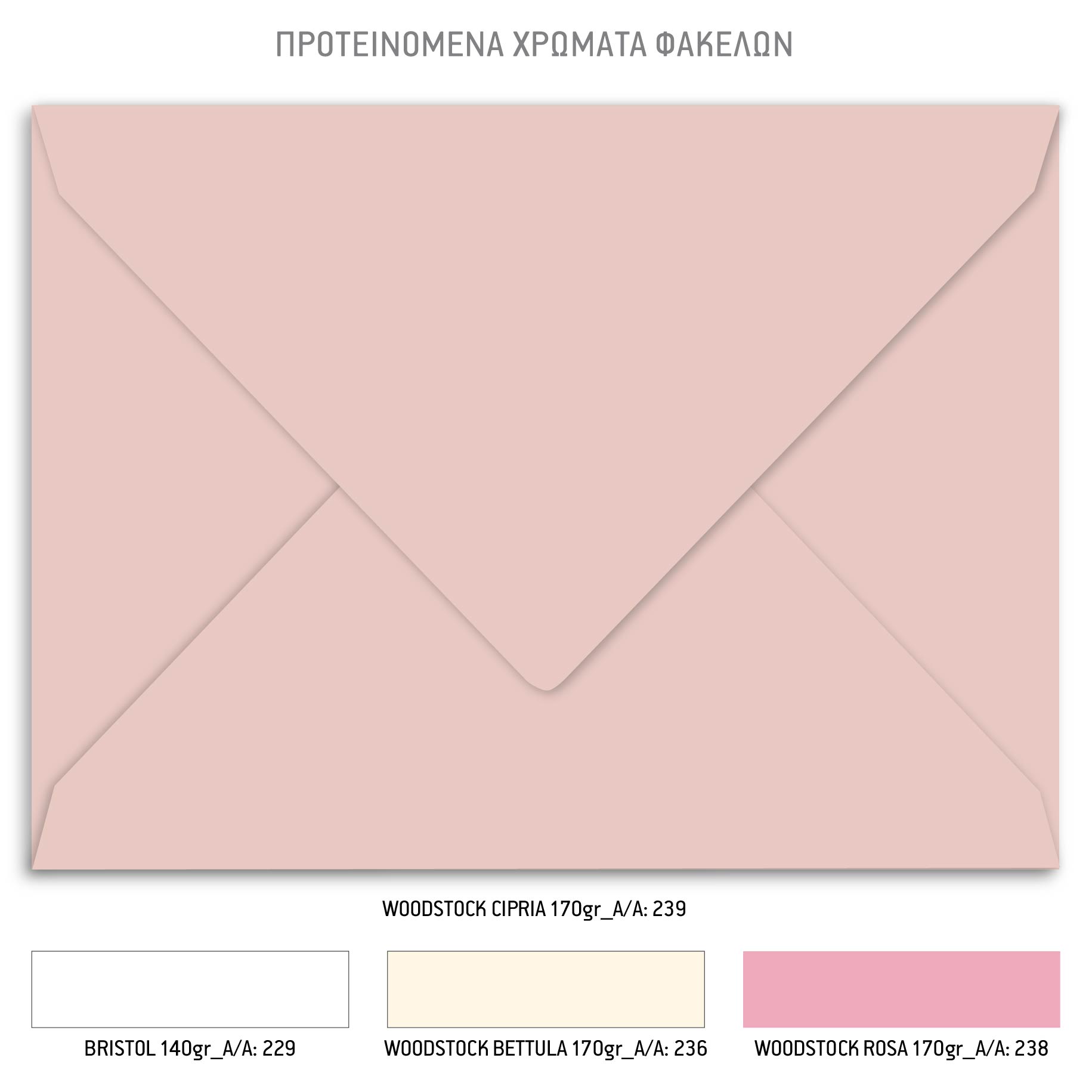 Η κάρτα του προσκλητηρίου είναι τυπωμένη σε λευκό ματ χαρτί 250 γρ. Το προσκλητήριο διαθέτει φάκελο διάστασης 19,5 x 14,5 εκ. σε χαρτί της επιλογής σας από τους αναγραφόμενους κωδικούς.