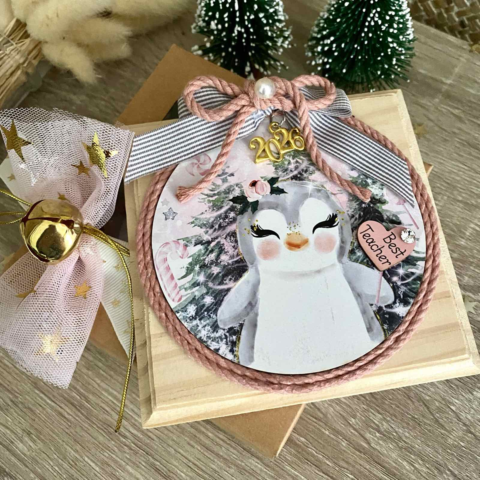 Χριστουγεννιάτικο ξύλινο καδράκι για την καλύτερη δασκάλα με θέμα το πιγκουινάκι. Είναι διακοσμημένο με ριγέ κορδέλα, κορδονάκι σε σάπιο μήλο, περλίτσα, μεταλλικό ασημί στοιχείο 25 και ροζ καρδούλα best teacher.