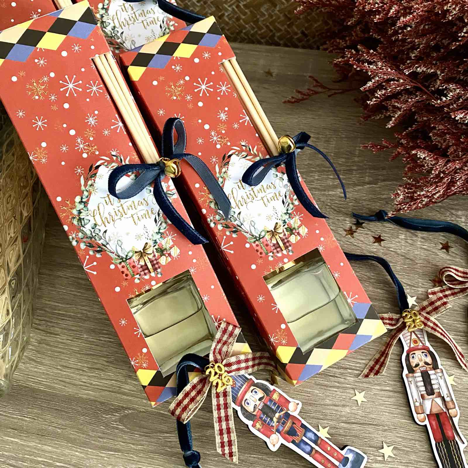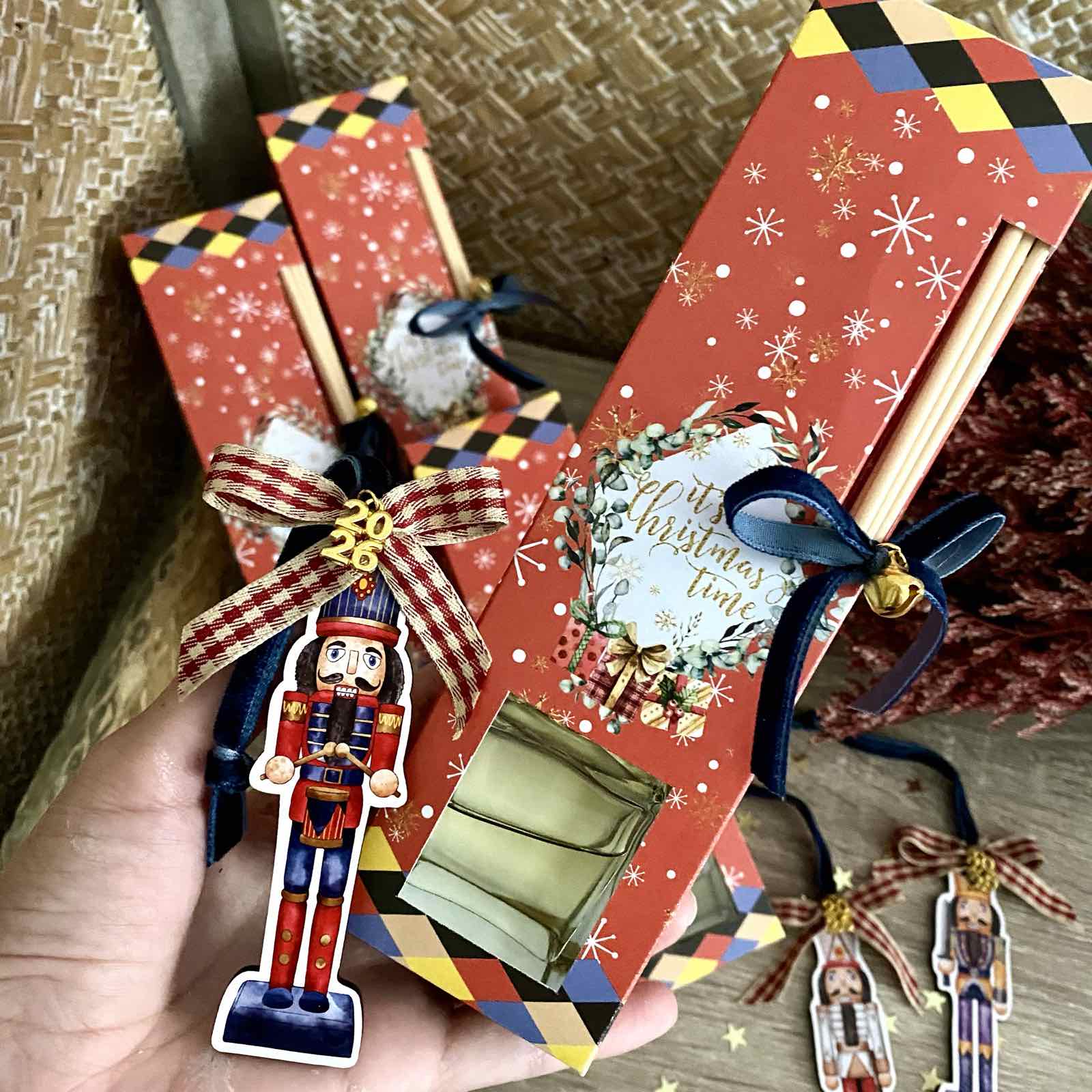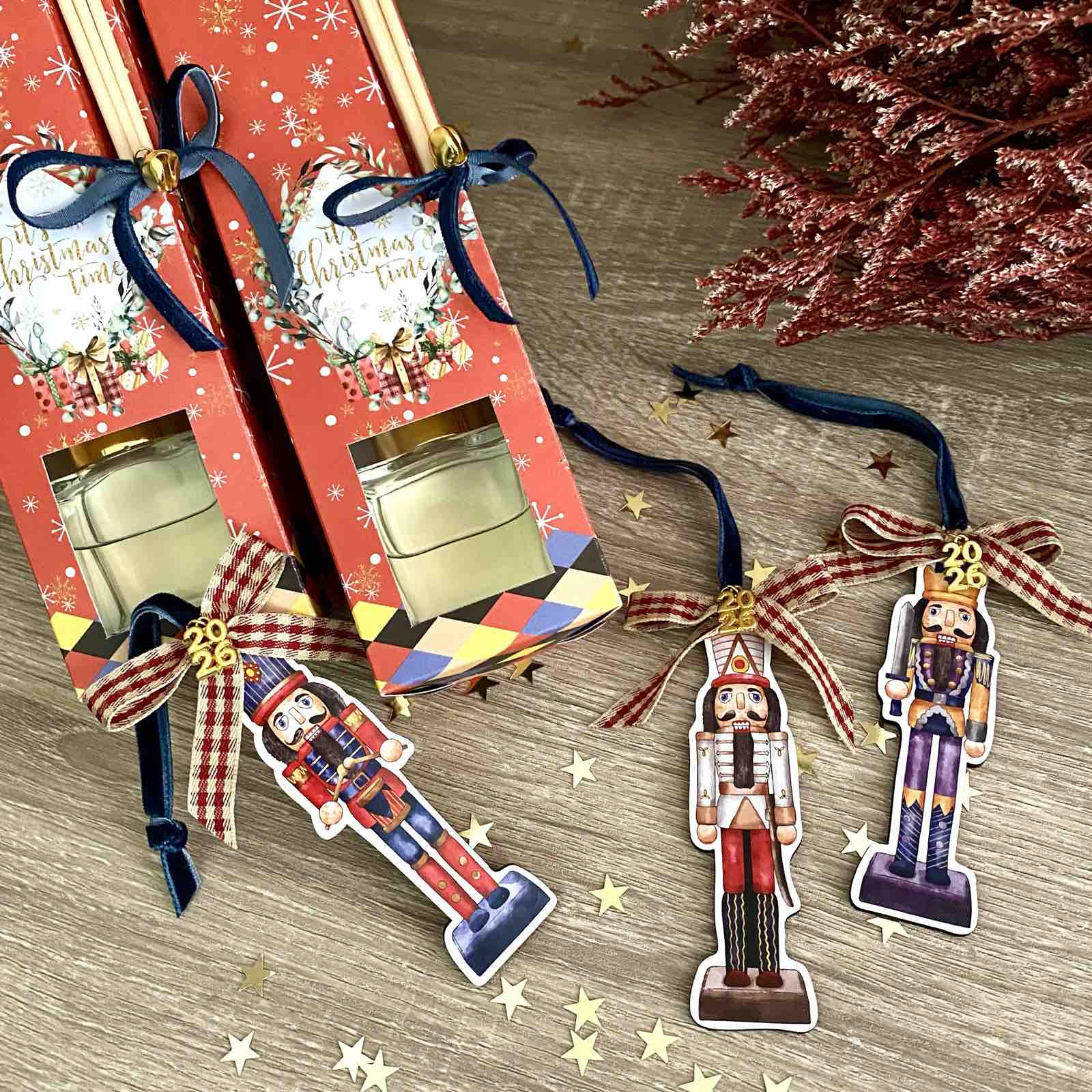 Σετ δώρου με αρωματικό χώρου σανταλόξυλο 50ml και ξύλινο γουράκι καρυοθραύστης μέσα σε χριστουγεννιάτικο κουτάκι με θέμα τον καρυοθραύστη.