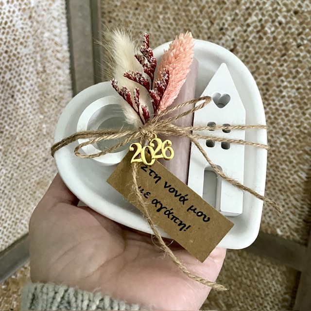 Χειροποίητο κηροπήγιο σε σχήμα καρδιάς με σπιτάκι φτιαγμένα από σκόνη πορσελάνης. Το σετ συνοδεύεται από κεράκι σε μπεζ χρώμα και διακοσμητικά αποξηραμένα λουλούδια.