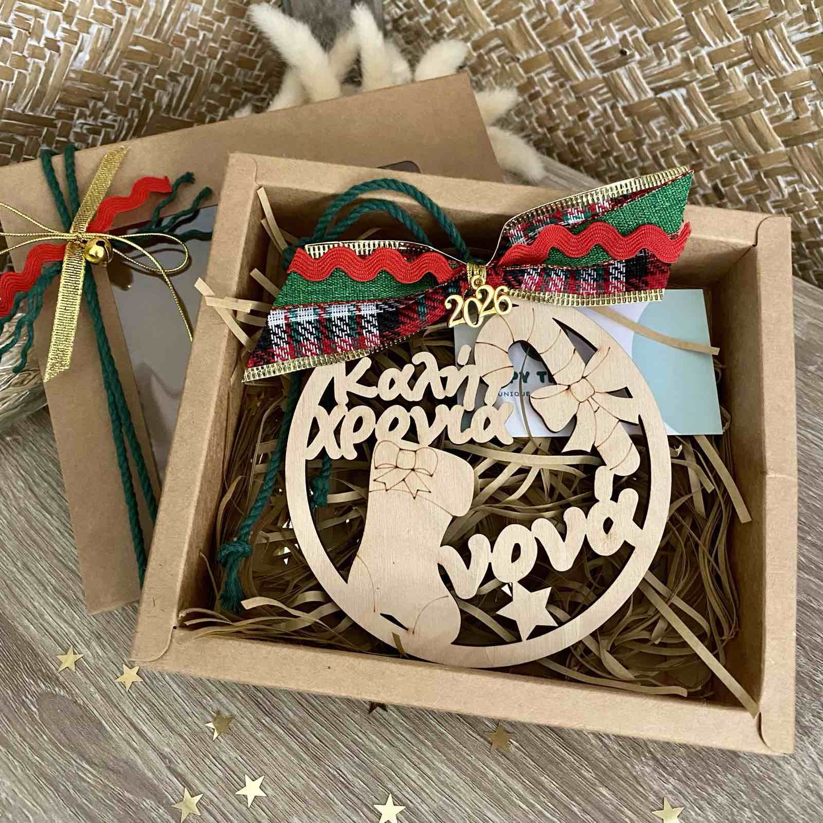 Γούρι 2026 ξύλινο χριστουγεννιάτικο στολίδι με τη φράση "Καλή χρονιά νονά".