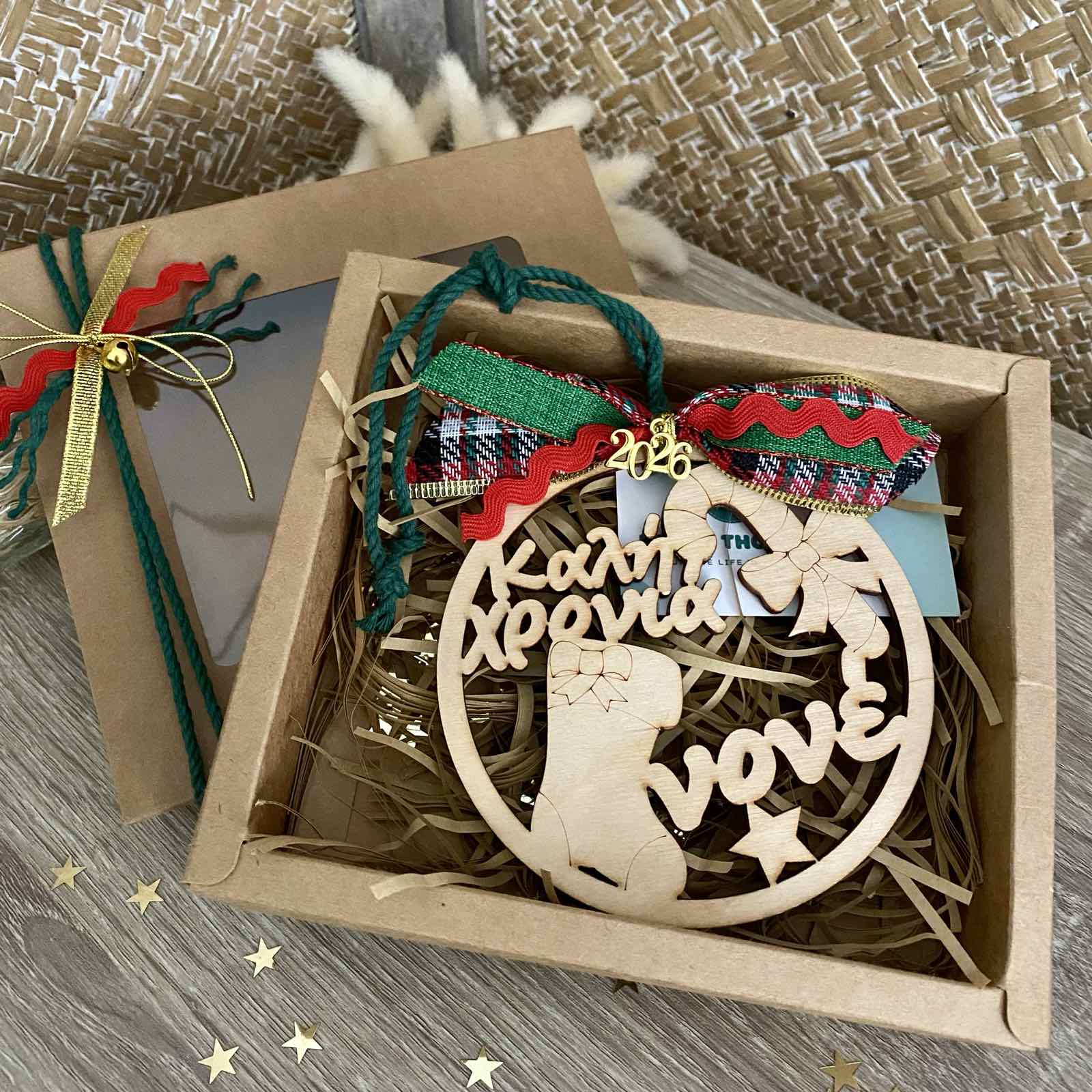 Γούρι 2026 ξύλινο χριστουγεννιάτικο στολίδι με τη φράση "Καλή χρονιά νονέ".