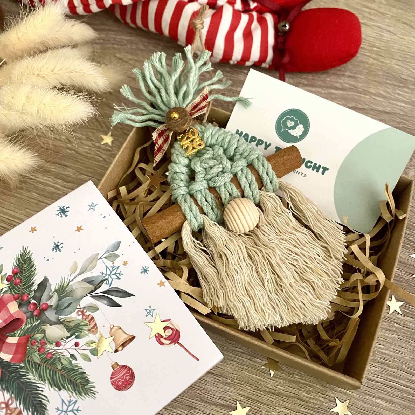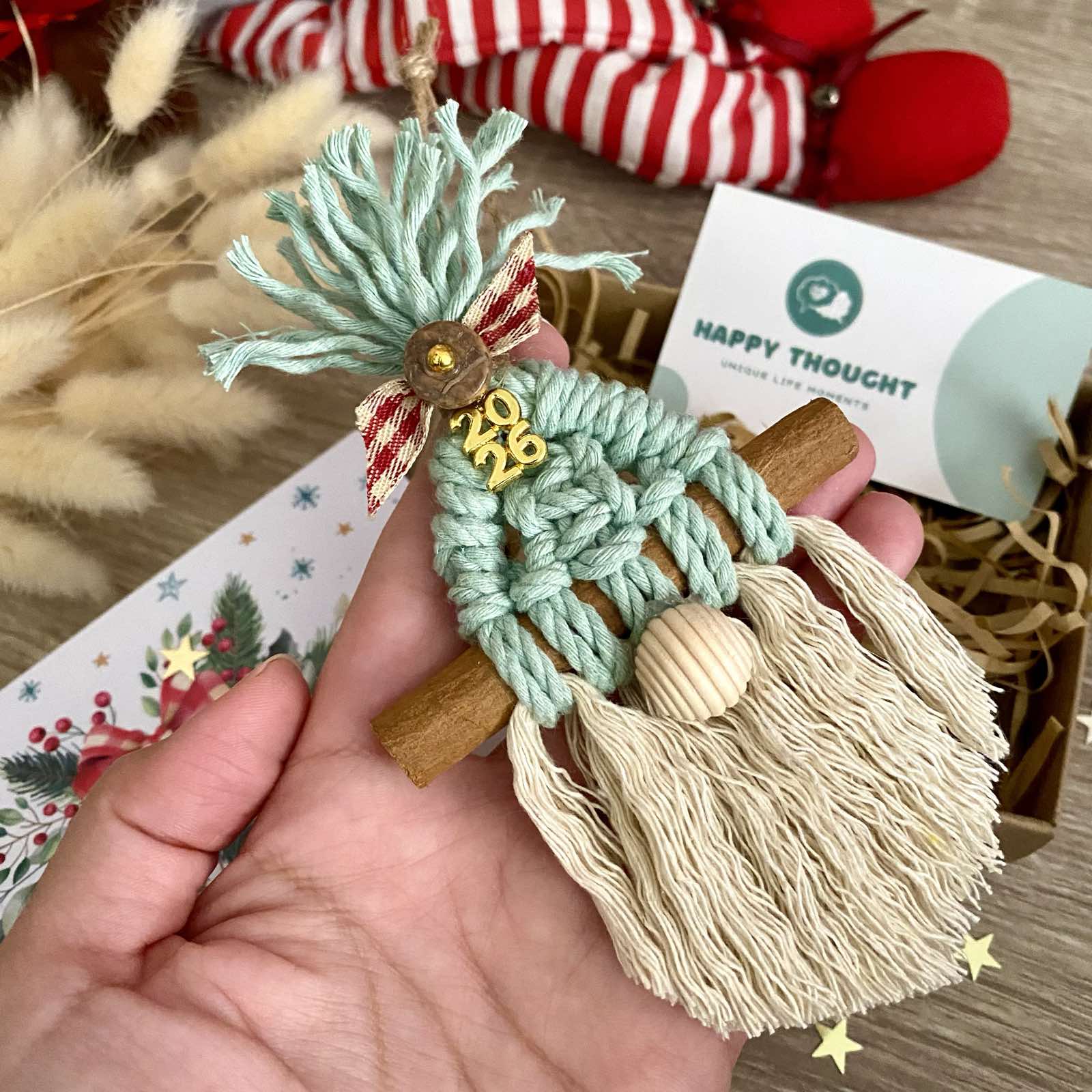Χειροποίητο γούρι 2026 μακραμέ νάνος σε ξύλο κανέλας.