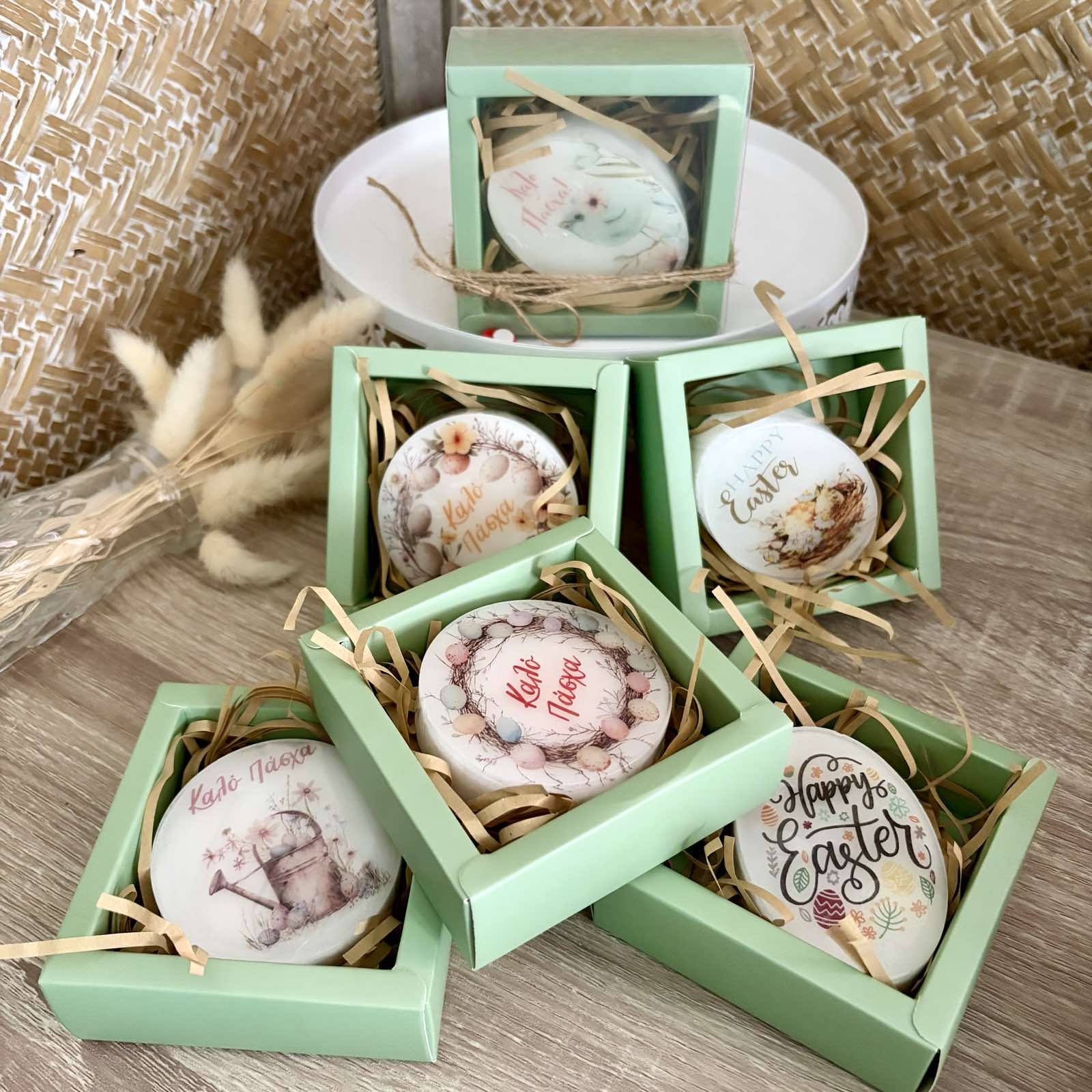 Αρωματικό σαπουνάκι στρογγυλό ή οβάλ με ευχές για "Καλό Πάσχα" σε χάρτινο κουτάκι στο χρώμα της μέντας.