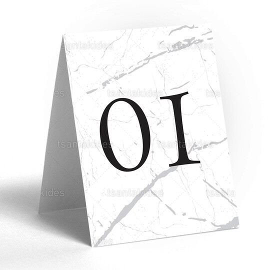 Δίπτυχη κάρτα αρίθμησης τραπεζιού γάμου εκτυπωμένη με θέμα save the date και σχεδιασμό σε στυλ μάρμαρο