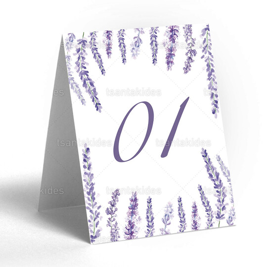 Δίπτυχη κάρτα αρίθμησης τραπεζιού γάμου εκτυπωμένη με θέμα λεβάντα