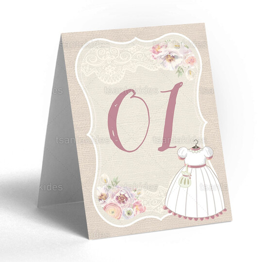Δίπτυχη κάρτα αρίθμησης τραπεζιού γάμου εκτυπωμένη με θέμα vintage λεπτομέρειες