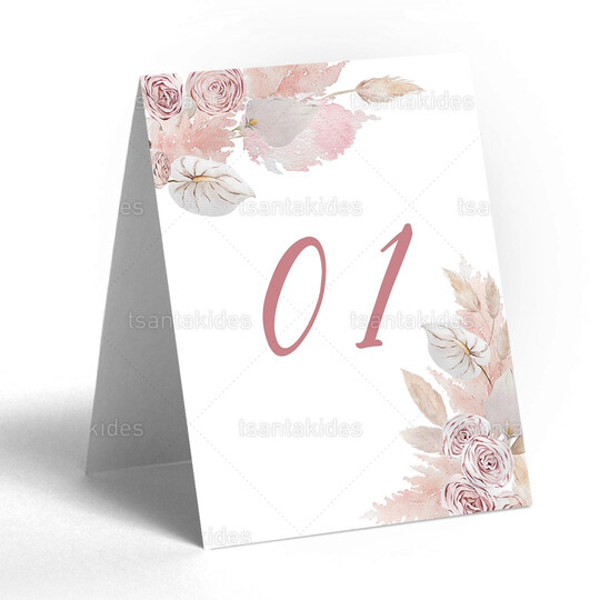 Δίπτυχη κάρτα αρίθμησης τραπεζιού γάμου εκτυπωμένη με θέμα bohemian και pampas λουλούδια
