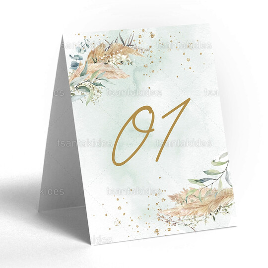 Δίπτυχη κάρτα αρίθμησης τραπεζιού γάμου εκτυπωμένη με θέμα pampas σε pastel αποχρώσεις