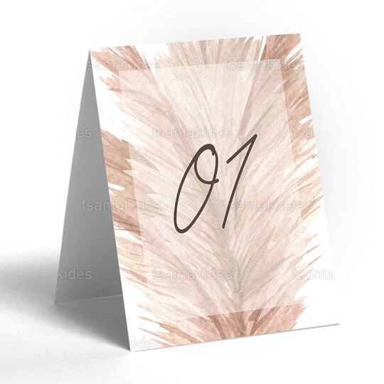 Δίπτυχη κάρτα αρίθμησης τραπεζιού γάμου εκτυπωμένη με θέμα pampas