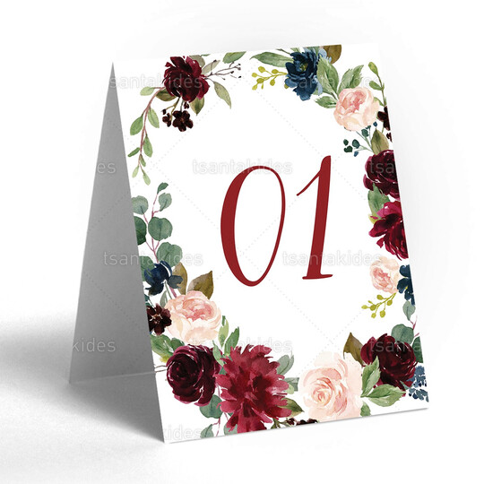 Δίπτυχη κάρτα αρίθμησης τραπεζιού γάμου εκτυπωμένη με θέμα floral σχεδιασμό