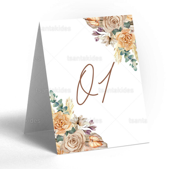 Δίπτυχη κάρτα αρίθμησης τραπεζιού γάμου εκτυπωμένη με θέμα floral pampas